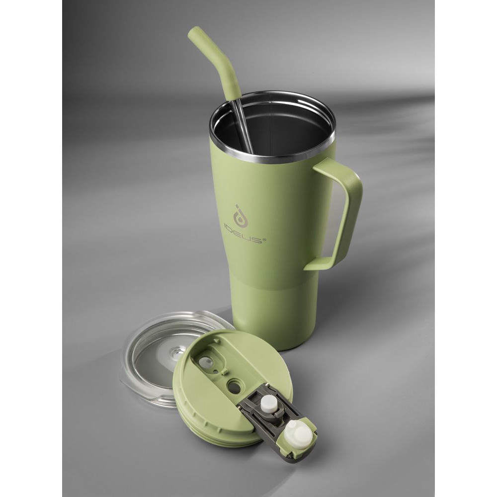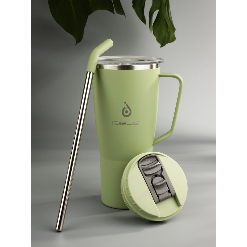- 2 крышки в комплекте: одна на 100% герметичная с механизмом блокировки отверстия для питья, вторая — с отверстием для трубочки