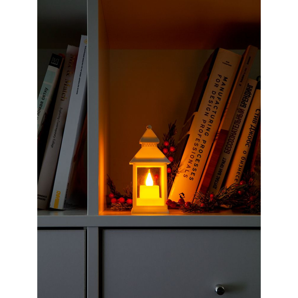 Внутри LED-свеча с теплым светом. Работает от 3 батареек типа LR44 (в комплект не входят).