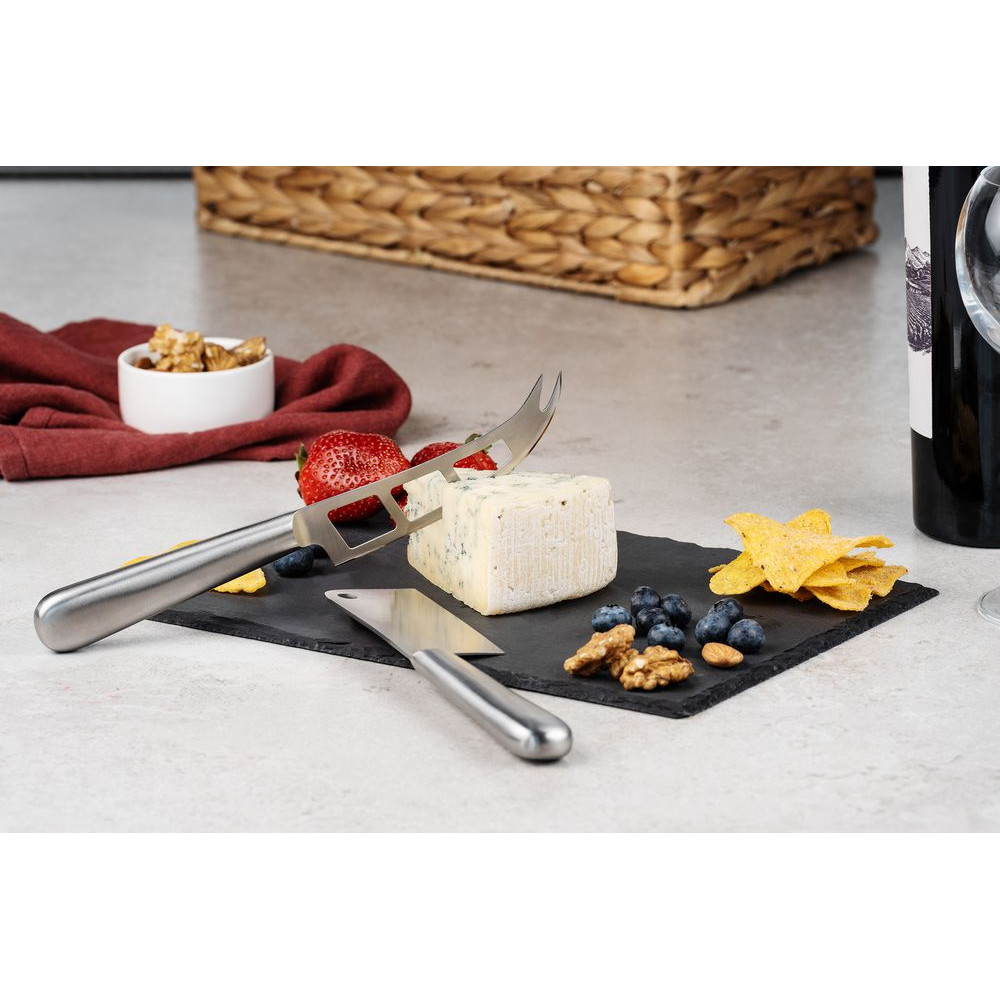 Выполненная из сланца доска идеальна для подачи закусок.В комплекте сланцевая доска, нож-топорик для твердых сортов сыра, нож для сыров средней мягкости.