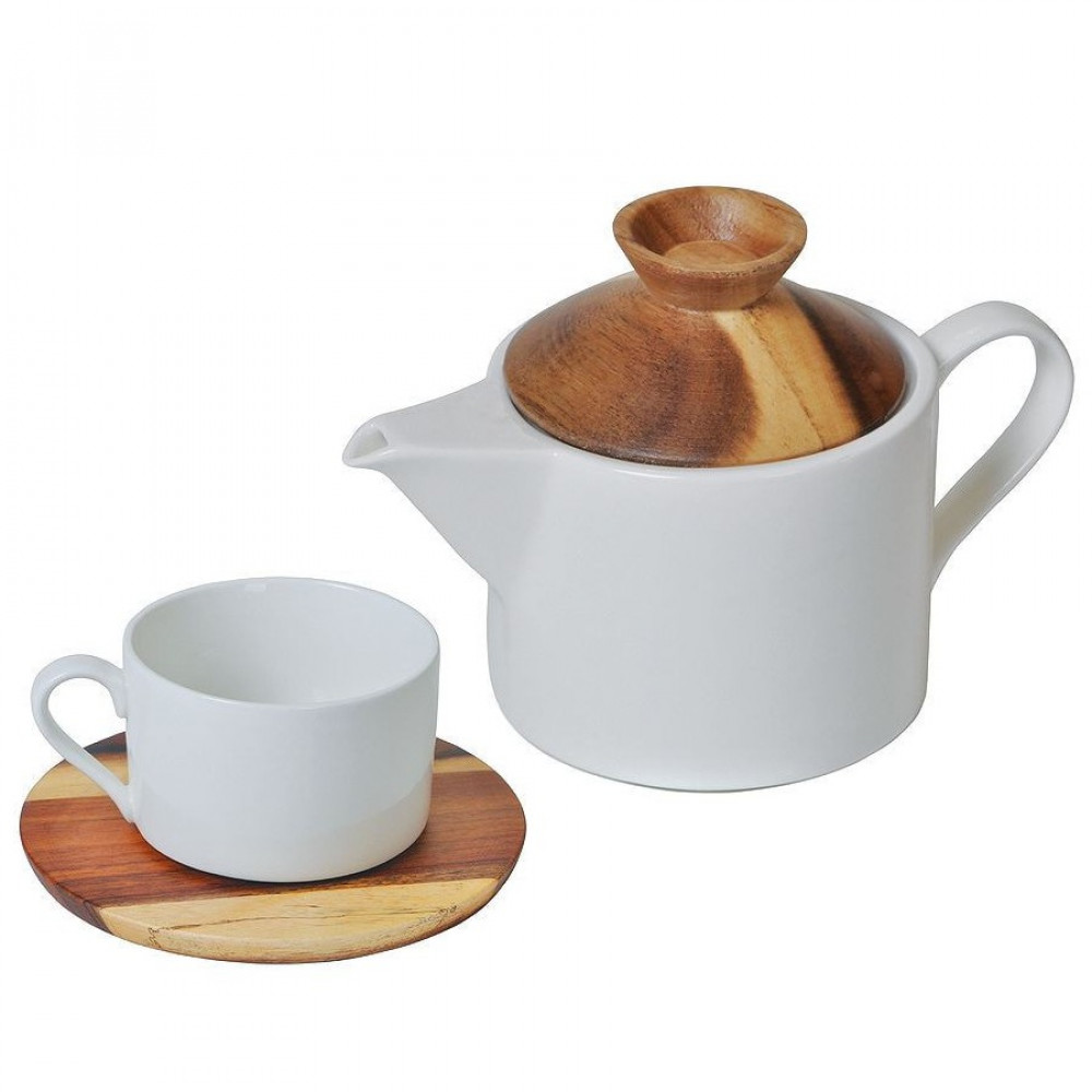 Крышечка чайника и подставка для чашки выполнены из акации, которая отличается особой прочностью и плотностью и поэтому не разбухнет от воды и влаги.Белый фарфор идеально сочетается с деревянными элементами. Только посмотрите на это великолепное стильное сочетание нежного молочного фарфора с пестрой текстурой дерева!