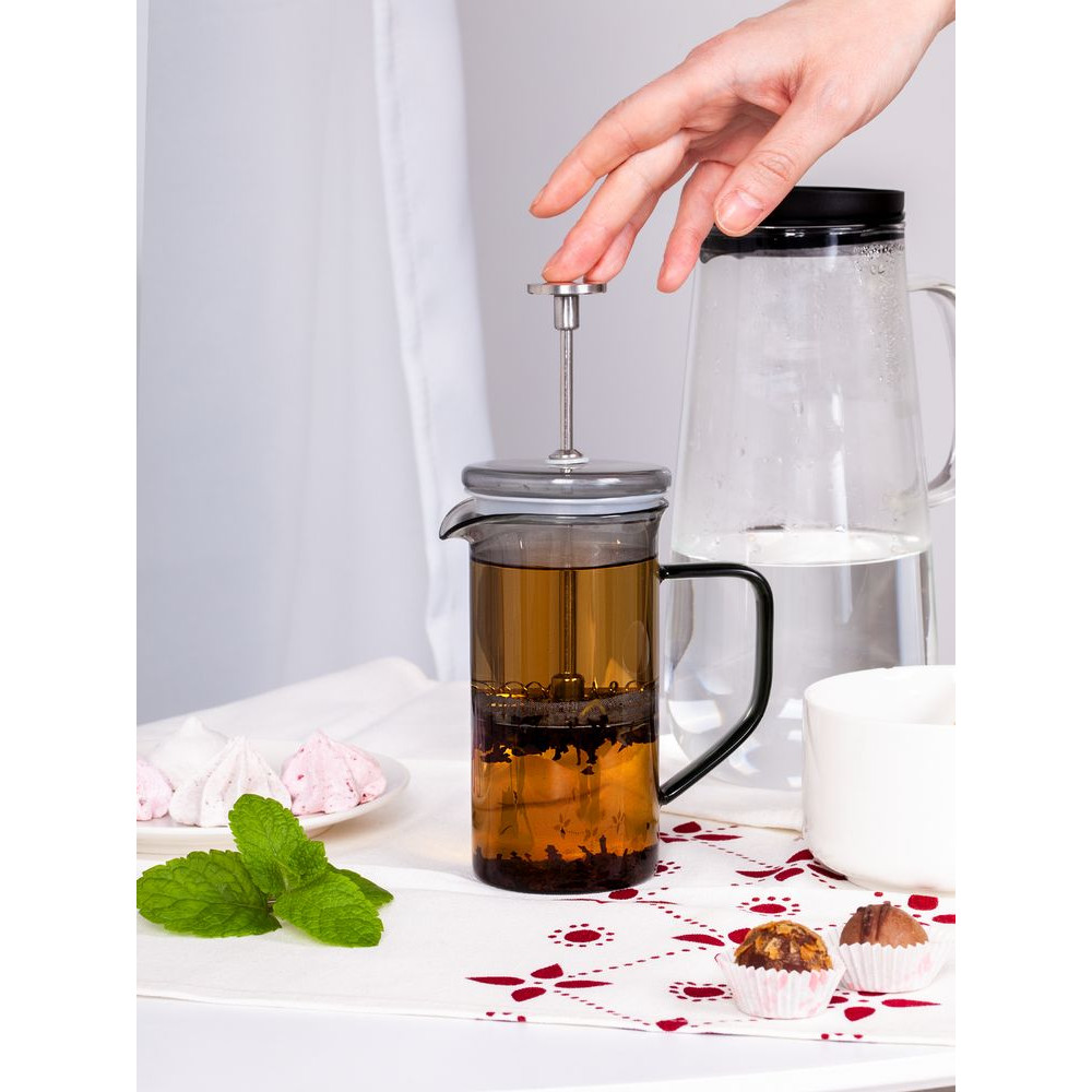 - Опустите пресс-фильтр: он плотно прижмет кофе или чайные листья ко дну колбы и не даст им попасть в напиток.