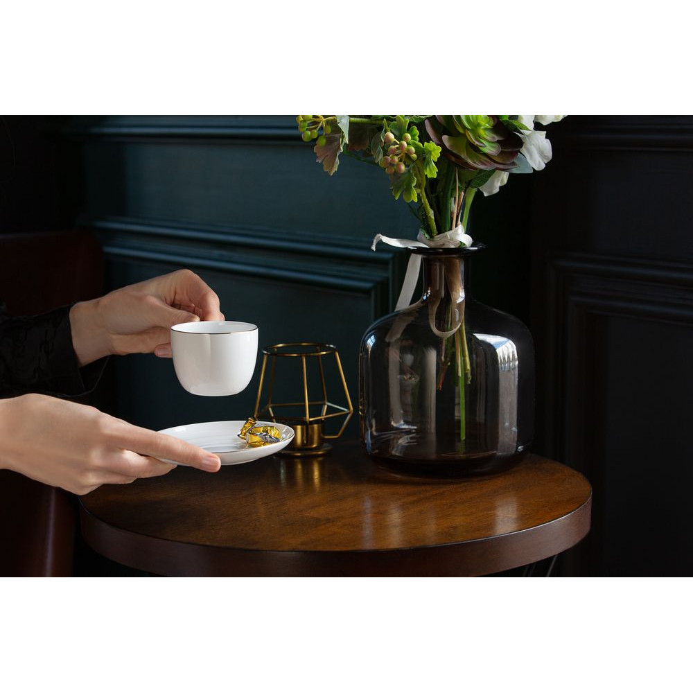 С кофейной парой Mansion Select легко почувствовать себя особенным. Кофейная пара обращает на себя внимание тонкой отводкой с металлическим блеском по краю предметов и изящной формой, а подарочная упаковка делает этот комплект роскошным подарком.