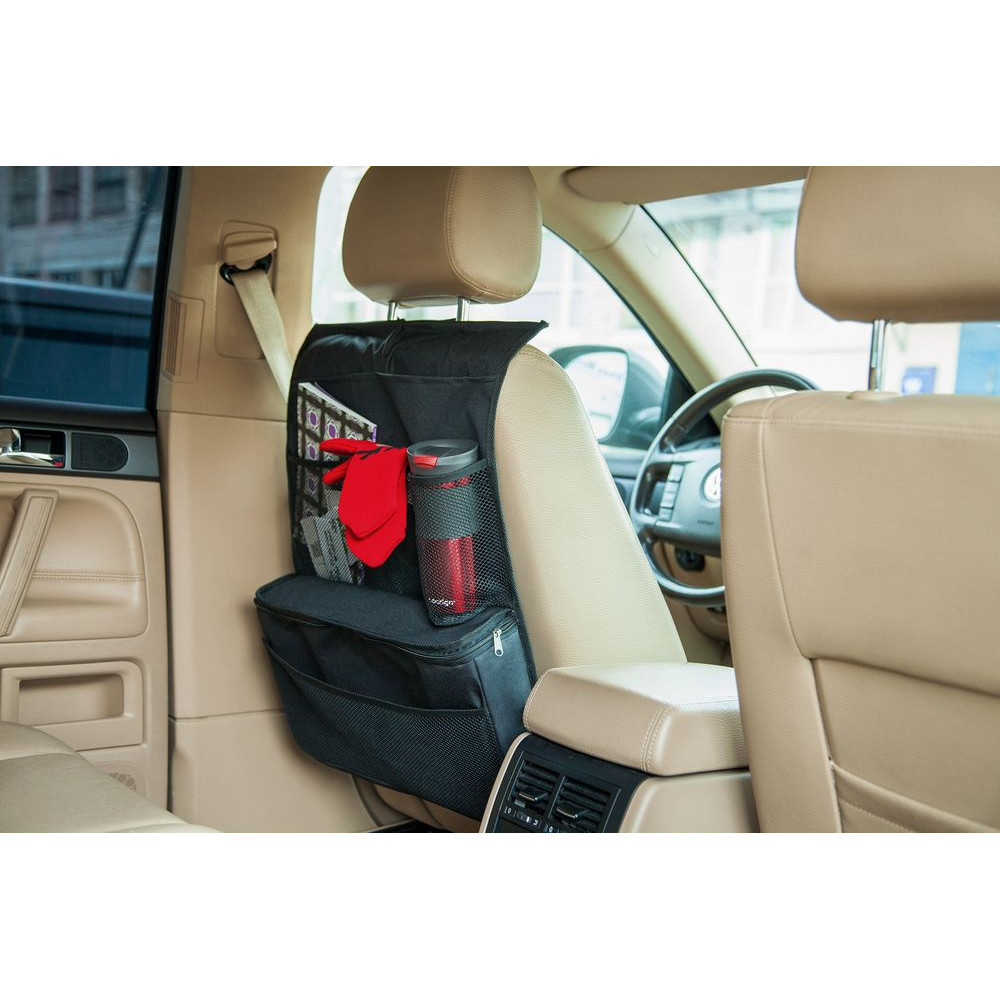 Органайзер защищает спинку сидения от загрязнений и позволяет компактно разложить все необходимые вещи. Найдется место для журналов, ручек и карандашей, очков, гаджетов, бутылки с водой и других необходимых в дороге мелочей. Вместительное термоотделение сохранит напитки или йогурты холодными, а бутерброды — горячими.Органайзер крепится за подголовник с помощью петли на липучке и фиксируется на спинке сиденья резинкой. Жесткие вставки не позволяют верхним углам провисать.